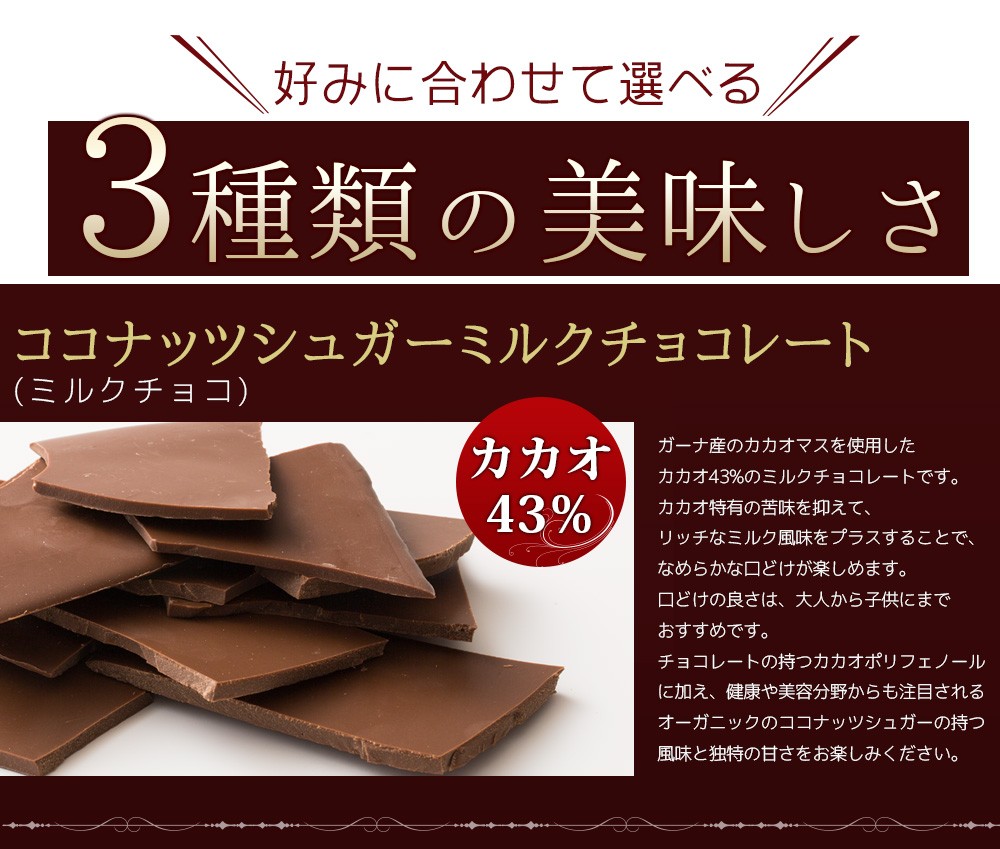 | ●43%カカオココナッツシュガーミルクチョコレート(ミルクチョコ) |