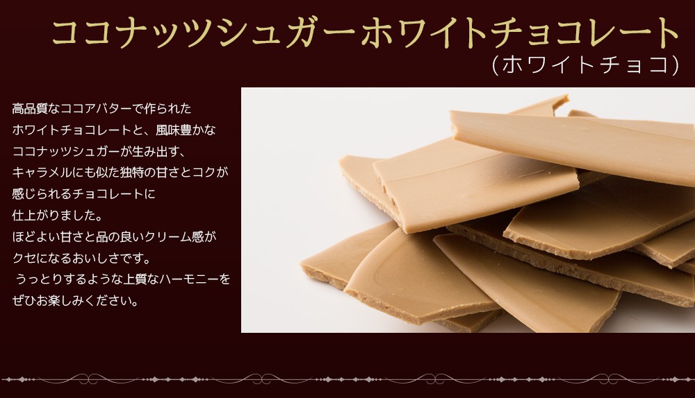 | 高品質なココアバターで作られたホワイトチョコレートと、風味豊かなココナッツシュガーが生み出す、キャラメルにも似た独特の甘さとコクが感じられる商品です。ほどよい甘さと品の良いクリーム感、どなたにも喜ばれる味わいです。 厳選された素材が醸し出す、うっとりするようなハーモニーをお試しください。 |
