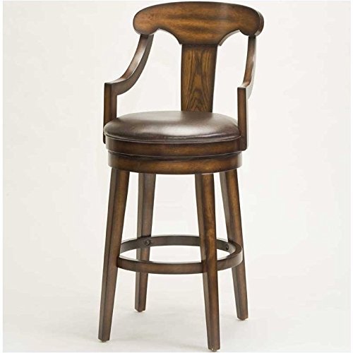 -. Feature : Overall dimensions: 22W x 23D x 41.5H inches / Swivel seat with curved back and arms / Hardwood frame and legs with faux leather / Traditional look with tapered legs and curved arms / Rustic oak finish with brown, faux leather seat