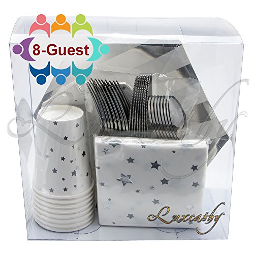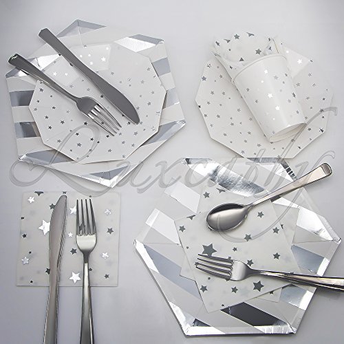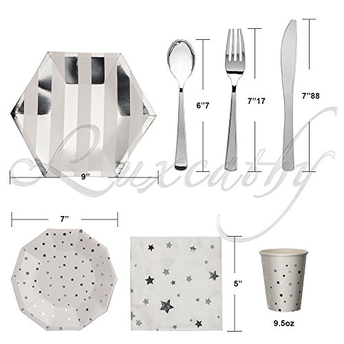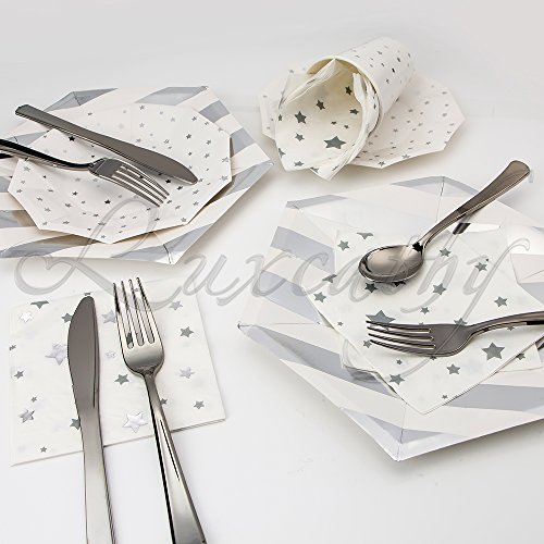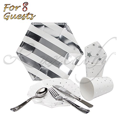 Luxcathy 8 Guest Served Hexagon Stripes and Stars Party Dinnerware Set - Disposable Plates , Cups, Napkins , Knives, Forks, and Spoons (Silver)