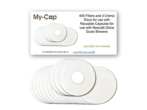INCLUDES: 400 single use paper filters and 3 crema discs for use with My-Cap reusable capsules for Dolce Gusto Brewers