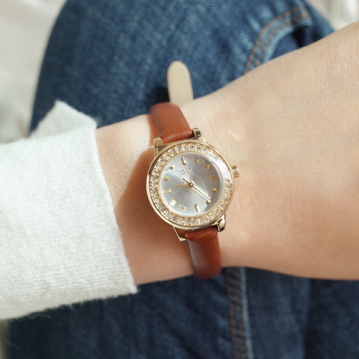 베이직한 갈색 밴드에 실버로 반짝이는 문자판의 조합이 유니크한 가죽시계
