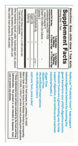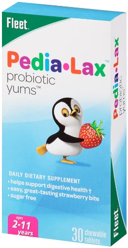 -. Binding : Health and Beauty -. Brand : Pedia-Lax -. EAN : 0301320001778 -. Feature : Easy way to support kids' digestive health with good bacteria / Formulated for kids ages 2-11 / As many live cultures as a serving of yogurt / Great-tasting strawberry flavor / Easy to chew, no need for liquid -. IsAdultProduct : 0 -. Label : Pedia-Lax -. LegalDisclaimer : Except as expressly set forth in the item description, seller makes NO EXPRESS OR IMPLIED warranties of any kind whatsoever about this merchandise.Seller is not responsible for consequential, incidental or punitive damages of any kind whatsoever. Seller's liability is limited to the amount paid by Buyer including shipping/handling charges. -. Manufacturer : Pedia-Lax -. Model : 301320001778 -. MPN : 0301320001778 -. NumberOfItems : 1 -. PackageQuantity : 1 -. PartNumber : 0301320001778 -. ProductGroup : Health and Beauty -. ProductTypeName : HEALTH_PERSONAL_CARE -. PublicationDate : 2013-02-26 -. Publisher : Pedia-Lax -. ReleaseDate : 2015-07-16 -. Size : 30 EA -. Studio : Pedia-Lax -. Title : Pedia-Lax Probiotic Yums, Strawberry, 30 Chewable Tablets -. UPC : 301320001778