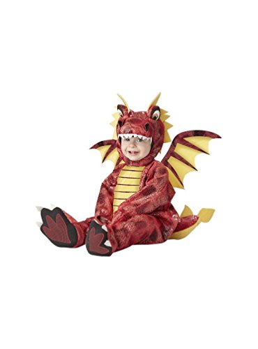 -. Binding : Apparel -. Brand : California Costumes -. Color : Red -. Department : boys -. Feature : Available in babies size (12-18 months) and (18-24 months). / Includes red and yellow screen printed dragon jumpsuit with scale details, attached tail, snap closure legs, detachable wings and dragon hood. -. ProductGroup : Apparel -. ProductTypeName : DRESS -. Title : Adorable Dragon Baby Costume