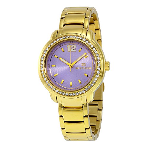 Gold-tone stainless steel case and bracelet. Fixed gold-tone bezel set with crystals. Lavender dial with luminous gold-tone hands and index hour markers. An Arabic numeral appears at the 12 o'clock position. Minute markers around the outer rim. Dial Type: Analog. Quartz movement. Scratch resistant mineral crystal. Pull / push crown. Solid case back. Case diameter: 35 mm. Case thickness: 10 mm. Round case shape. Band width: 15 mm. Deployment clasp. Water resistant at 30 meters / 100 feet. Functions: hour, minute, second. Dress watch style. Tommy Hilfiger Calle Lavender Dial Gold-tone Stainless Steel Ladies Watch 1781561.