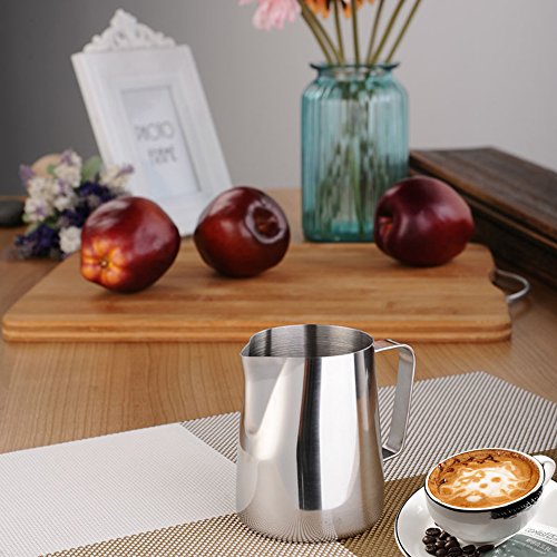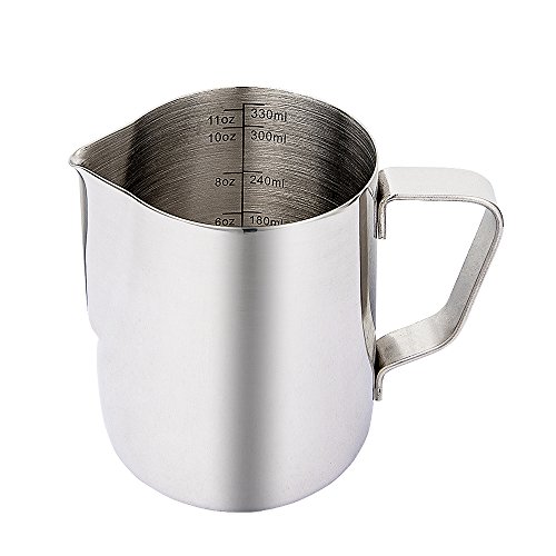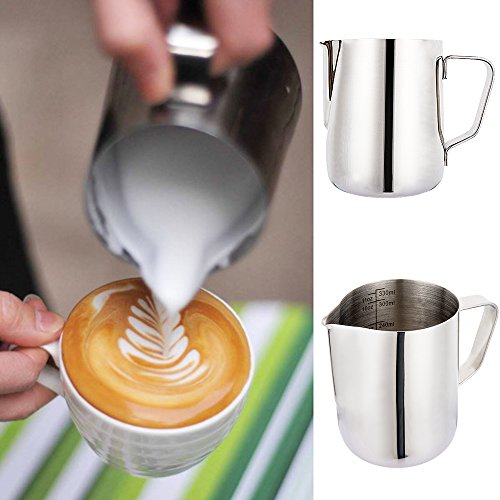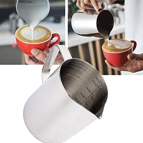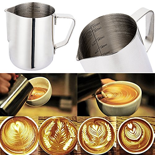 MEASUREMENT SCALES INSIDE: Make the perfect espresso cup, latte arts, or green coffee with our premium milk frothing pitcher that features measurement scales inside.