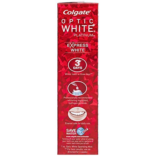 Colgate Optic White Platinum Express White Fresh Mint Toothpaste's breakthrough formula is Colgate's fastest whitening toothpaste to date giving you whiter teeth in just three days just by brushing. The toothpaste contains two-times more of the whitening ingredient, hydrogen peroxide. Having a radiant and polished look is quick and easy with Colgate Optic White Platinum Express White.