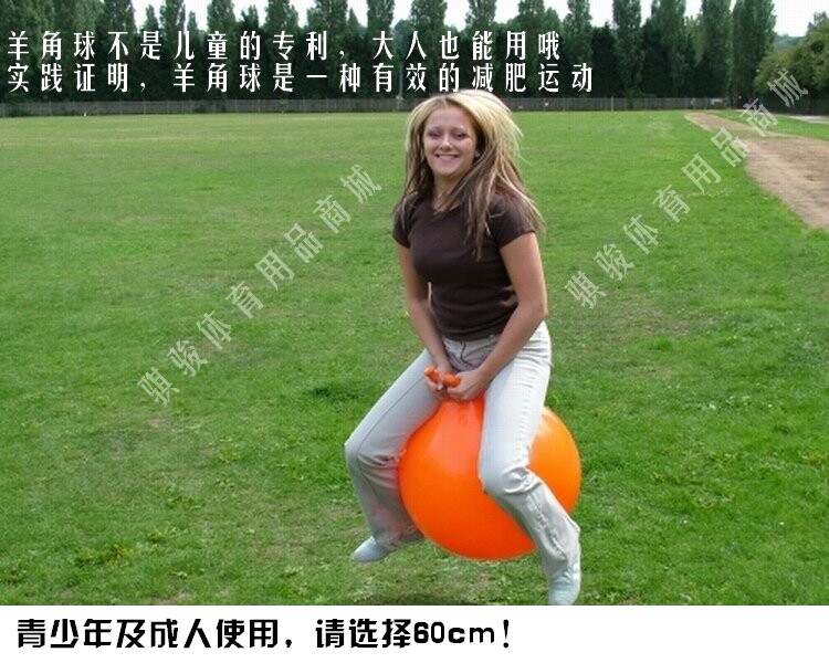 因跳跳球上长两个羊角而得名,是一种最新型集娱乐、健身为一体的运动器材,适用于儿童玩耍和女性健身锻炼,风靡欧美,国内的健身房和幼儿园也相当流行。羊角球具有坐、骑、跳、拍等功能,使用安全可靠,富有弹性,小孩骑上它蹦蹦跳跳活泼可爱,可促进儿童骨骼发育,增加血液循环,促使儿童增高,并有助于锻炼孩子的腿部力量,掌握协调和平衡能力;对于肥胖者,在使用过程中,可以燃烧并转化腹部多余脂肪,从而达到减肥的目的;时尚女士亦可用作球操器材,做球操时运动者的心率保持在每分钟115~135次之间,人不会感到气喘,但消耗的热量却达到每45分钟3~6千卡路里!!长期使用,可达到减肥、收腹、提臀、健胸的功效,增强心肺功能、体力、耐力、平衡力,尤其易于塑造腿部曲线,紧缩臀部,创造迷人身材!