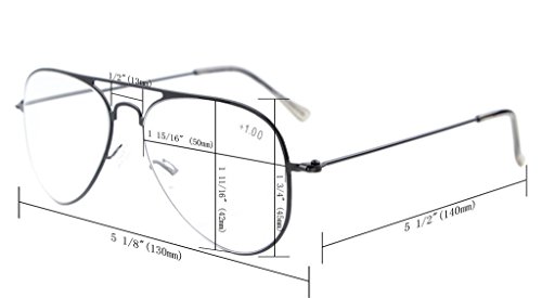 -. Feature : PRODUCTS DIMENSION-Frame material: Metal,Lens width: 1 15/16" (50mm),Frame width: 5 1/8"(130mm),Lens height: 1 11/16" (42mm),Frame height: 1 3/4" (45mm),Bridge (DBL): 1/2"(13mm),Temple length: 5 1/2"(140mm),SP.R.Ing hinge: NO,Lenses: Aspheric,Head size: Narrow / EYEKEPPER AVIATOR ATYLE READING GLASSES-the pupil distance(PD) is 59-63mm,the deviation for pupil distance(PD) less than 2mm,the deviation for strength less than 0.02,the deviation for lenses's horizontal line less than 1mm / EYEKEPPER STAINLESS STEEL FRAME READING GLASSES-Included a protective case and microfiber Cleaning cloth.Acrylic Lens and Optically Correct / QUALITY METAL FRAME -FDA Registered Reading Glasses and Eyewear,Accord with ANSI Z80.3-2010,Accord with BS EN ISO 12312-1:2013 and EN14139:2010,Accord with AS/NZS 1067:2009 / LIFETIME BREAKAGE WARRANTY&30 DAY MONEY BACK GUARANTEE: In case any broken problem happens, contact the seller of Eyekepper without hesitation to solve the problem until satisfaction. Eyekepper provides lifetime after sale service for all Eyekepper reading glasses. Customers can return and get refunded for any reason. You have no risk to try