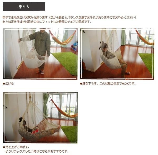 | あらゆるインテリアにマッチする、ナチュラルカラーのハンモックタイプのチェアです。体全体が包み込まれるようなフィット感が得られるため、椅子やソファとは違った感覚でリラックスできます。読書や映画鑑賞などに☆ |