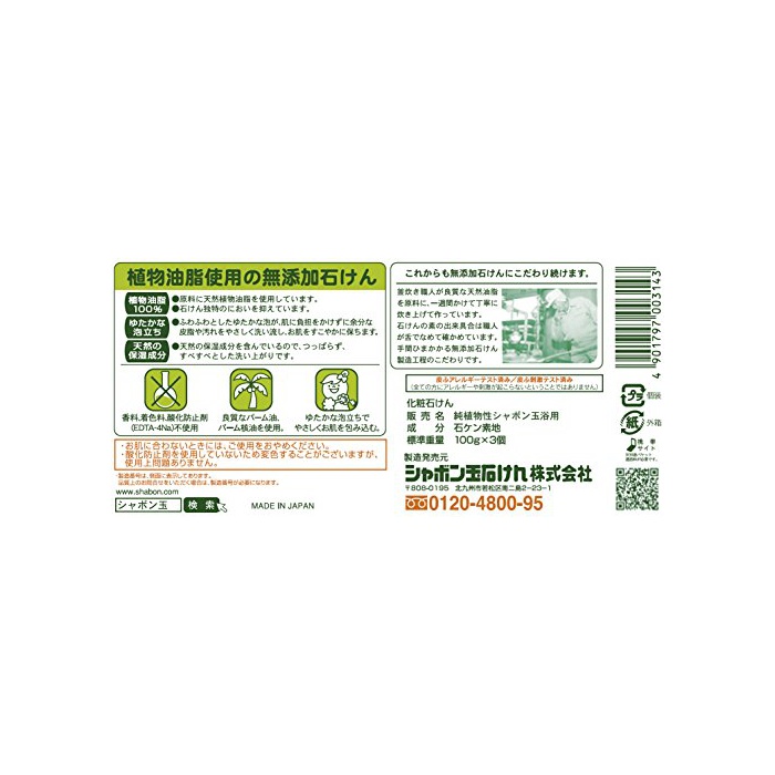 원본상품명: シャボン玉 無添加せっけん 純植物性シャボン玉 浴用 100g×3個入り