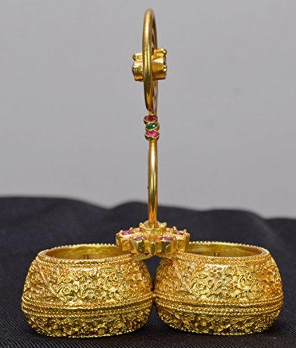 Griiham Brass Base With 22.5 Kt Micro Gold Plated Kumkum Haldi Tikka Tilak 2 In 1 Piece With Semipolished Ruby And Emerald.Height 8 Cms- Width 7 Cms