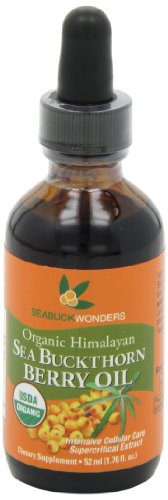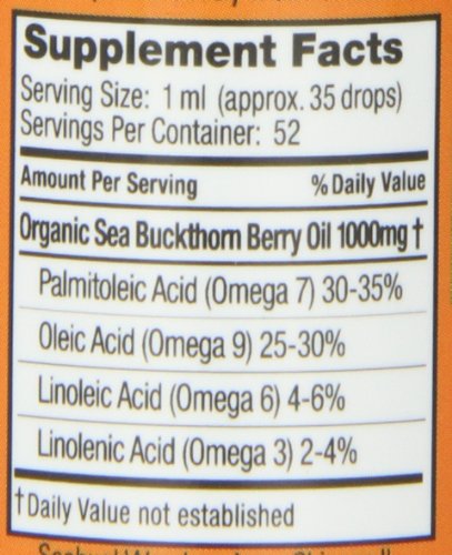 Intensive Cellular Care.Sea Buckthorn berry oil provides a rich supply of Omega 7 (30-35%), vitamins E and A, and the presence of the legendary SOD (superoxide dismutase), among other valuable nutrients, make this seabuckthorn berry oil invaluable for your health and beauty routine. Omega 7 is hailed as a special nutrient that may protect, replenish, moisten and restore the skin and mucus membranes that line the digestive and urogenital tracts. The synergistic effect of the above nutrients with hundreds of others, makes seabuckthorn berry oil a very effective beauty and age-defying product that is good for skin, gastrointestinal and urinary health, as well as hair and nails.Sea Buckthorn is THE superior source of Omega 7 Fatty Acids (Palmitoleic Acid). This plant-based omega provides the highest concentration of Omega 7 naturally available as well as a host of vitamins and minerals, over 190 phytonutrients, supercharged antioxidants, Omega 3s, and other powerful health agents. Omega 7 alternatives from Anchovies, Macademia nuts, and other Omega 7′s don’t come close to providing the full health potential that sea buckthorn’s incredible nutritional profile offers.Feature