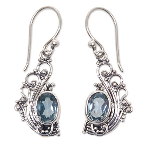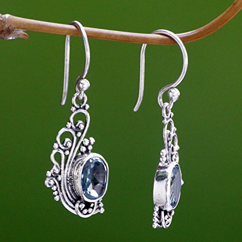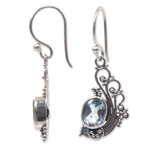 About this item: Like a peacock's brilliant plumage, silver tendrils extend upwards in a showy display. Bali artisan Sukartini crafts these feminine dangle earrings from sterling silver, adding 2 carats of sparkling blue topaz..925 Sterling silver earrings and hooks. Blue topaz has been irradiated to give it a blue hue. Earrings measure 1.5" by 0.5".