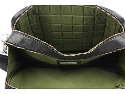 -. Feature : 90% leather/10% nylon / Comfortable handles / Quilted computer pouch with high density foam / Silver hardware / Fits laptops up to 15-Inches