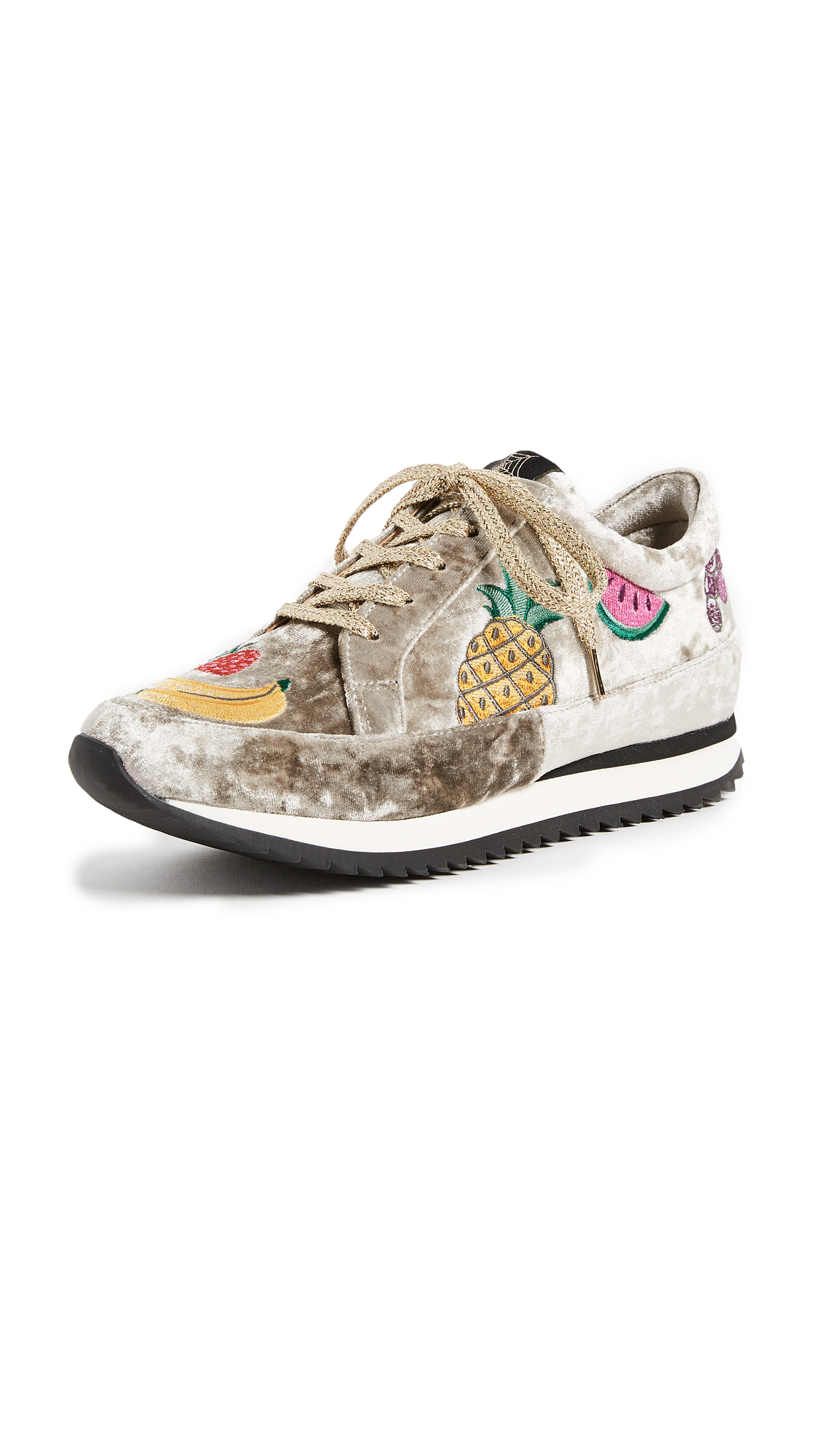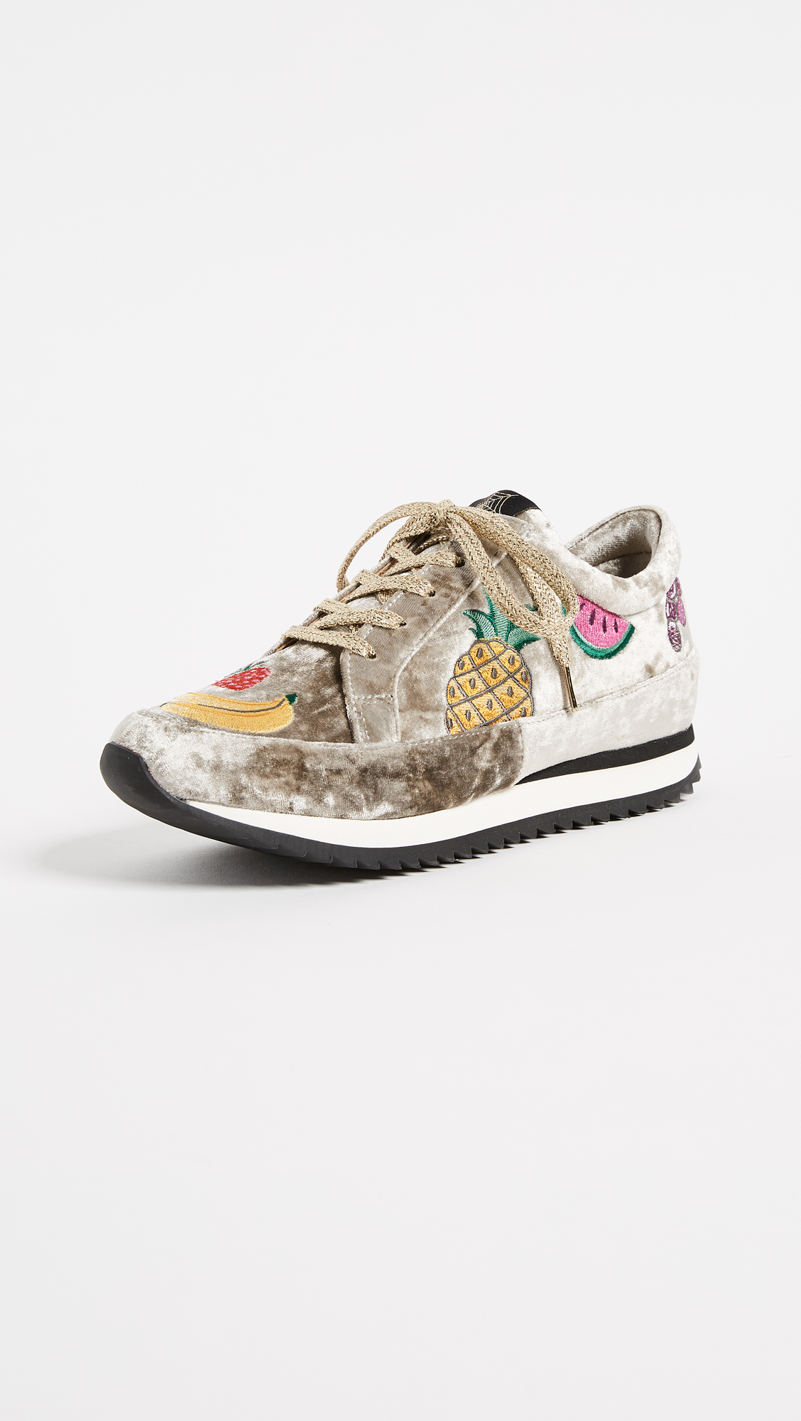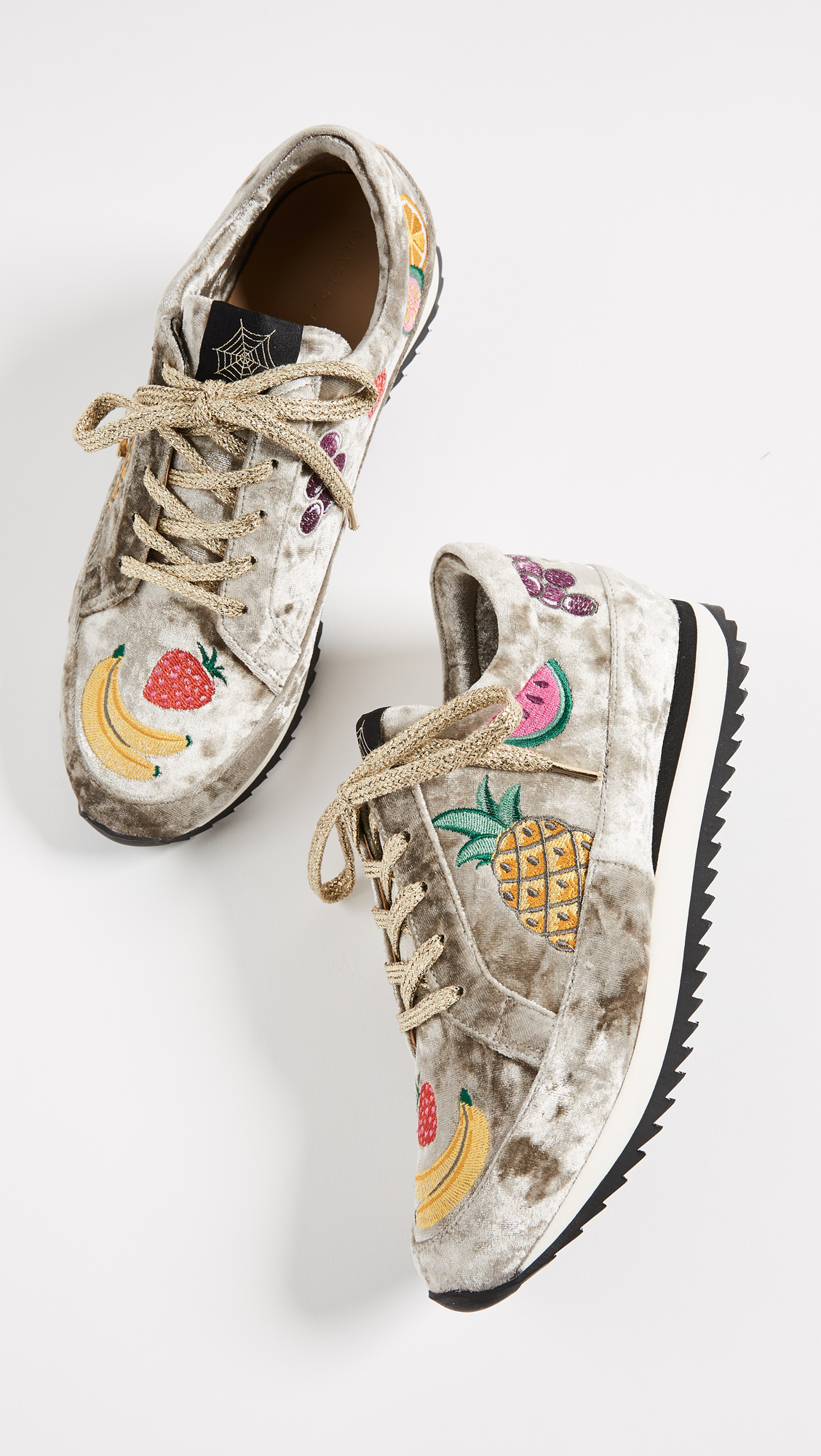 These crushed velvet Charlotte Olympia sneakers are detailed with colorful embroidered fruits. Shimmering shoelaces. Stacked foam platform and ridged rubber heel.Fabric: Velvet.Made in Portugal.MeasurementsPlatform: 1in / 25mm