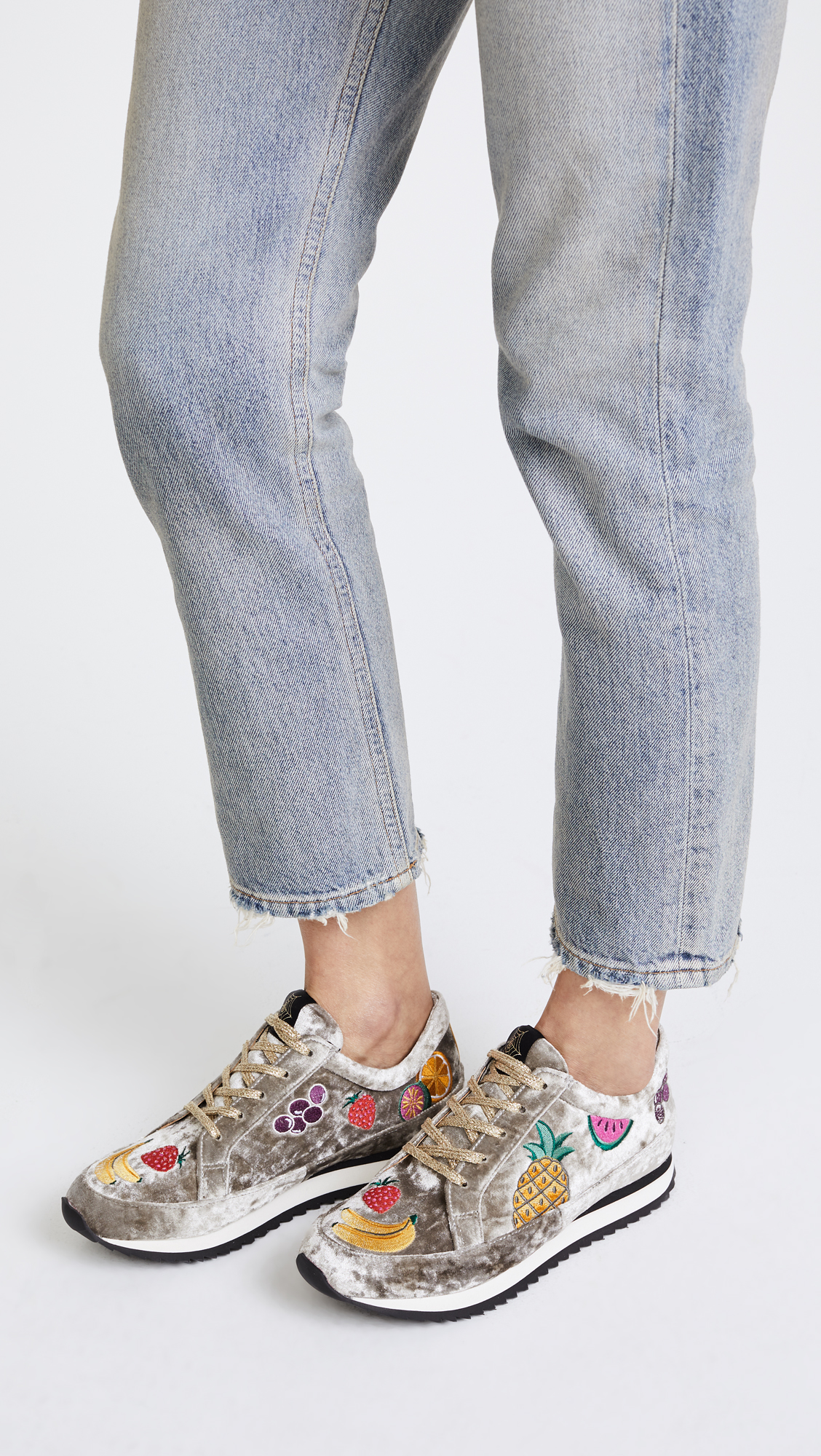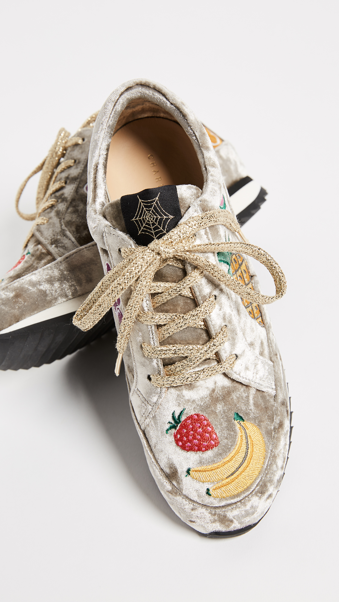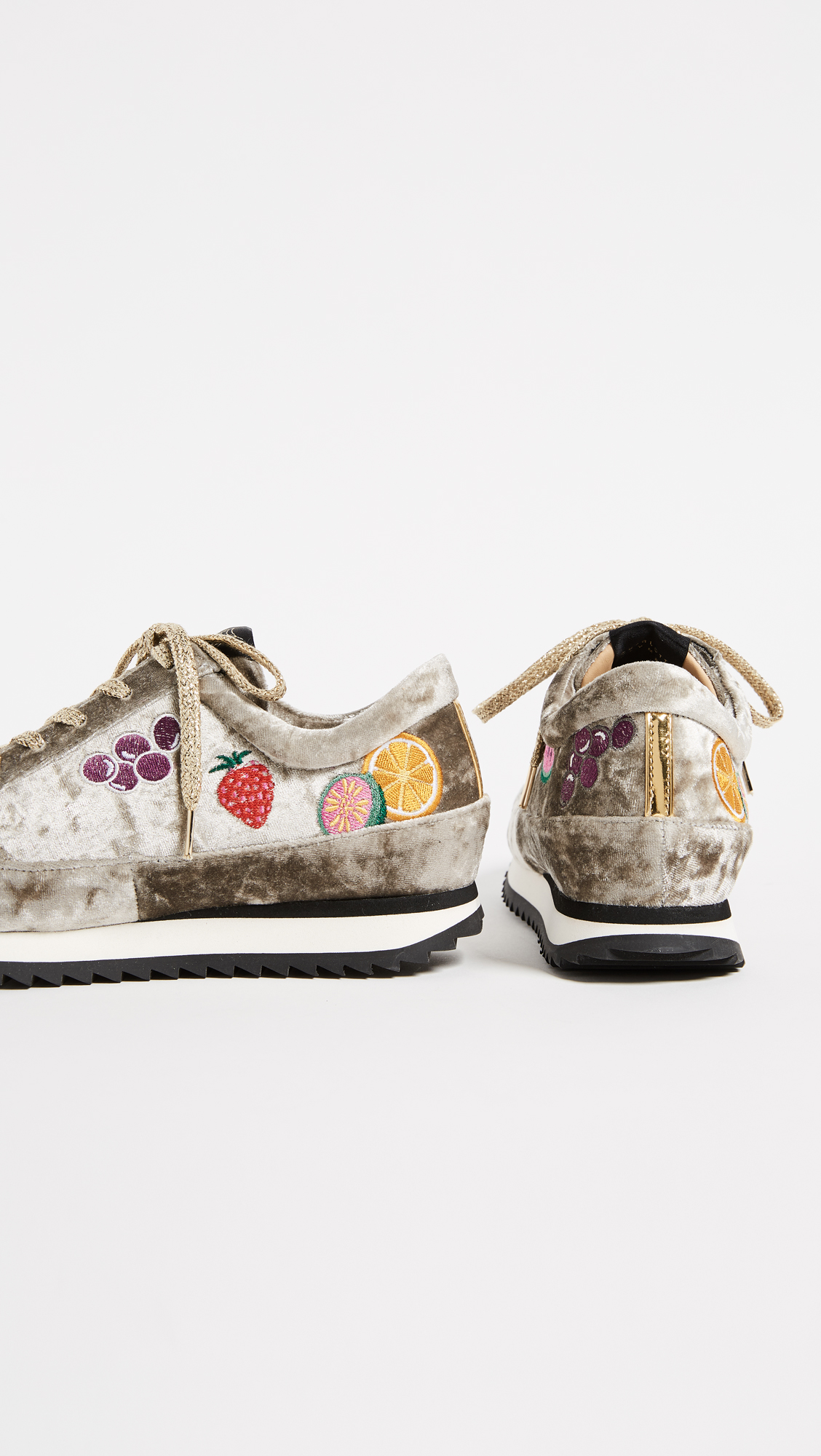 These crushed velvet Charlotte Olympia sneakers are detailed with colorful embroidered fruits. Shimmering shoelaces. Stacked foam platform and ridged rubber heel.Fabric: Velvet.Made in Portugal.MeasurementsPlatform: 1in / 25mm