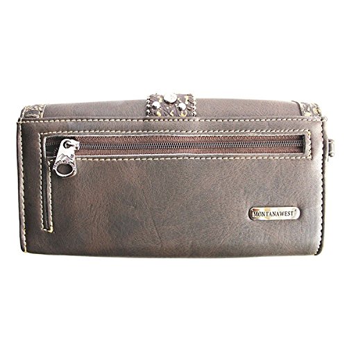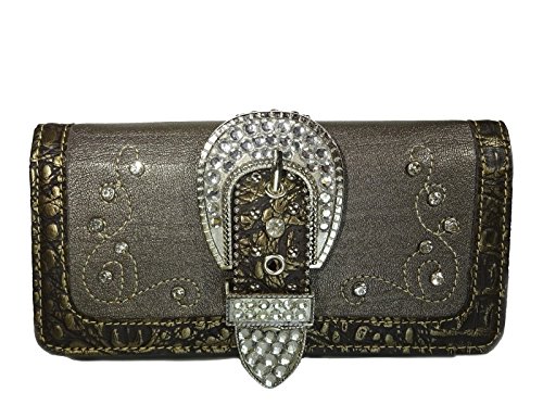 Studio : Western Fashion Publisher : Western Fashion Binding : Apparel Product Description Montana West® Rhinestone Western Buckle Wristlet Wallet- Pewter Wristlet Wallet: 7.5 x 4.5 x 1 - Features Metal Belt Buckle with Rhinestones, Rhinestone accents on Front - A zippered pocket on back -3 ID slots, 2 Compartments with Zipper pocket in middle, 2 bill slots, 11 Card Slots - Detachable Wristlet band 0