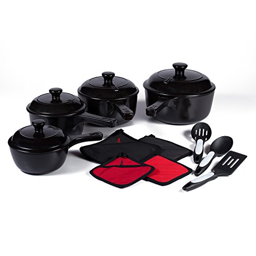 -. Feature : 100% All Natural Ceramic, No Metals, No Leaching / Includes: 16 Oz, 1 Qt, 1.5 Qt and 2.5 Qt Covered Long Handled Saucepans with (2) Black Silicone Pot Holders, (2) Red Silicone Pot Holders and 3 Piece Nylon Tool Set / Non-Scratch / Stove-Top, Oven, Grill, Microwave & Dishwasher Safe