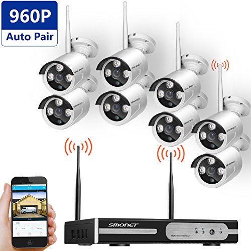 Smonet 8CH 960P Wireless Home Surveillance Security Camera System(WIFI NVR Kit),8pcs 1.3MP WIFI Bullet IP Cameras,Support Motion Detection Alarm and Remote View by ISO or Android App,No Hard Drive