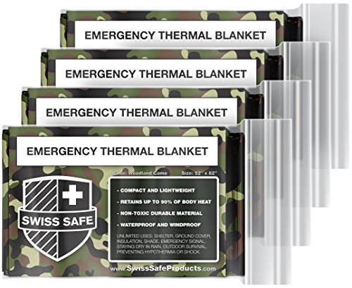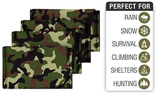 FOUR MYLAR EMERGENCY BLANKETS (Woodland Army Camouflage) - Advanced aluminized dual-sided Mylar blankets are perfect for conserving body heat in emergency survival situations. Includes four individually packed blankets so you can easily throw them in your hiking backpack, car, first aid kit, go-bag or bug-out bag, camping gear, or emergency kit at home or at work.