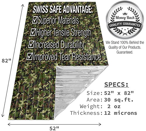 100% MONEY BACK GUARANTEE: If you are not completely satisfied with the quality of your Emergency Camo Thermal Blankets, Swiss Safe will replace them and/or you will be given your money back — no questions asked!
