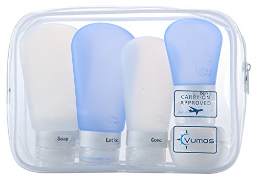- 4 SILICONE TRAVEL BOTTLES PLUS CREAM JAR; the Vumos® Silicone Travel Bottle Set includes four silicone bottles and a cream jar. The set can hold different toiletry products such as your shampoo, body lotion, soap, and one of your many face or body creams!