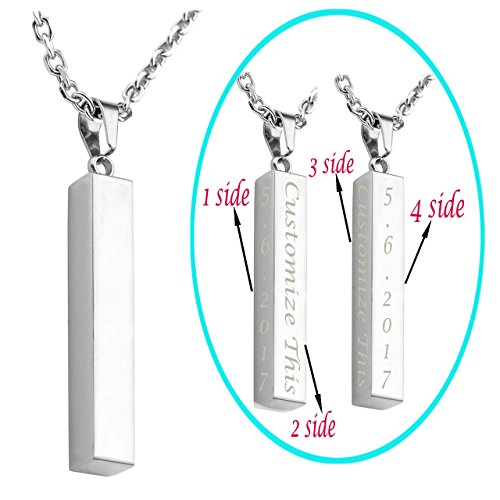 -. Binding : Jewelry -. Brand : PiercingJ -. Department : unisex-adult -. Feature : Package: Surgical Stainless Steel Pebdant + Chain+Gift Box / Size(appr): Pendant: 30mm Diameter; Chain: 24"Length; Pad: 22mmDiameter / Fashion and Functional: The pendant can be customized the information of Name, Birth, Sex, Age; Perfect for Mens and Womens. / Engraving: 4 Sides of the Rectangle Pendant can be laser engraved with 20 initials for each side (include the spaces and special symbols) / Customization: Each side of the pendant with 20 initials can be engraved.Please check the engraving content carefully before placing an order.If the Self-Customize Service can not satisfy your request,please "Contact Seller" after finish the payment immediately. -. Label : PiercingJ -. Manufacturer : PiercingJ -. ProductGroup : Jewelry -. ProductTypeName : FASHIONNECKLACEBRACELETANKLET -. Publisher : PiercingJ -. Studio : PiercingJ -. Title : PiercingJ Personalized Custom Message Engrave Name Bar Necklace Stainless Steel Pendant Chain Gift Box