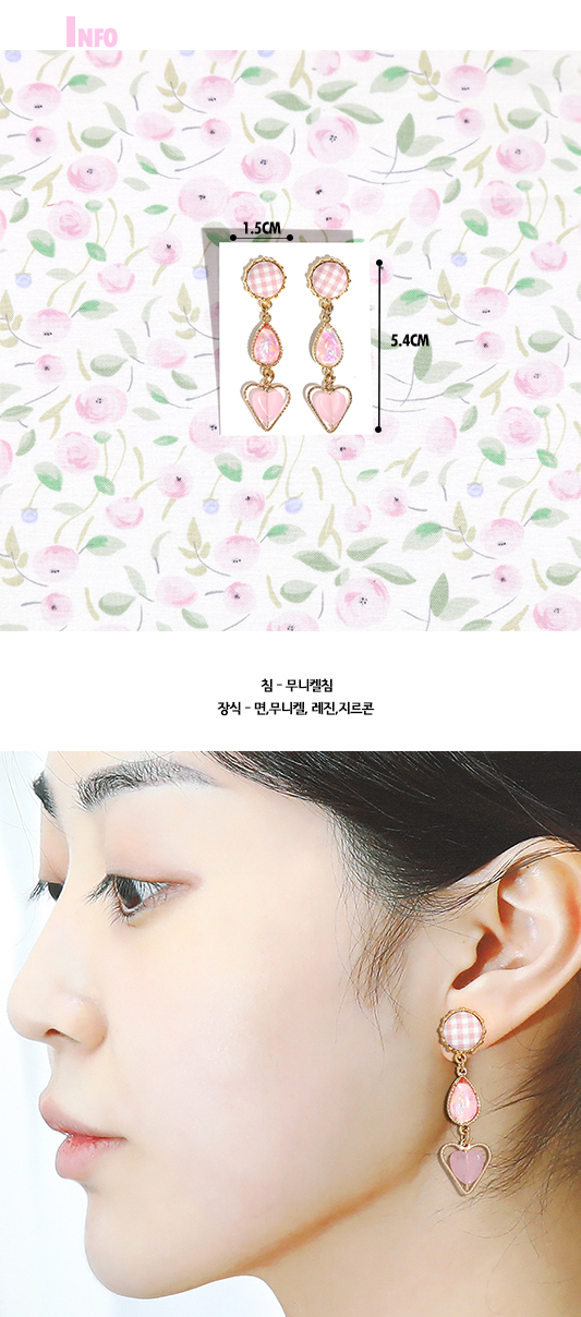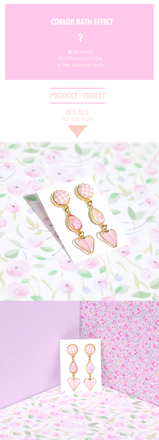 안녕하세요. 컬러배스입니다! <체크 핑크>귀걸이는 무니켈침(알러지방지처리)으로 제작된 하트&드롭 귀걸이입니다. 상세 내용은 아래 이미지 페이지를 확인해주세요.