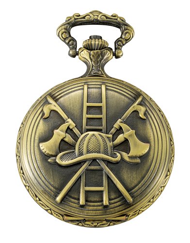-. Feature : Firefighter design antiqued gold-tone covered quartz day-date pocket watch / Bright white enamel dial with bold black Arabic numbers and antique style black hands / Scratch resistant mineral crystal / Includes matching 14" curb pocket watch chain with spring ring attachment / Arrives with deluxe draw string pouch and gift box, operating instructions, Selvyt polishing cloth and lifetime limited warranty card