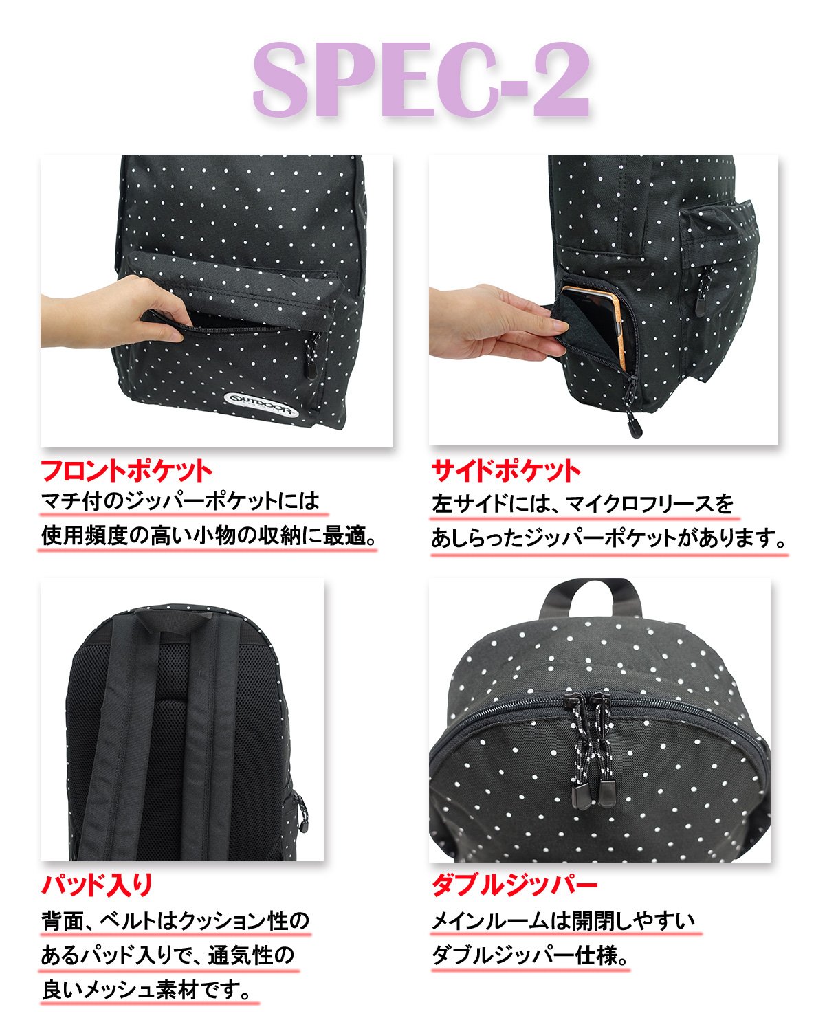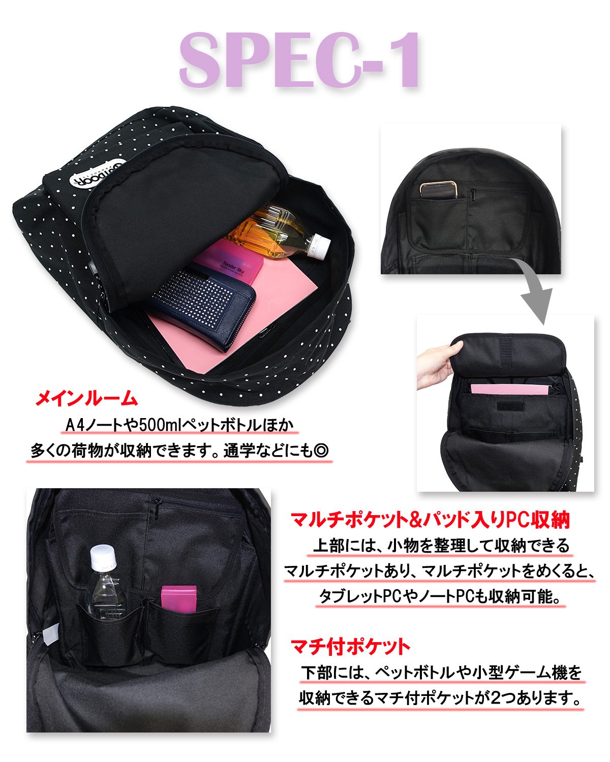 In addition to multiple inner pockets, PC space, equipped with side pockets perfect for smartphone storage.