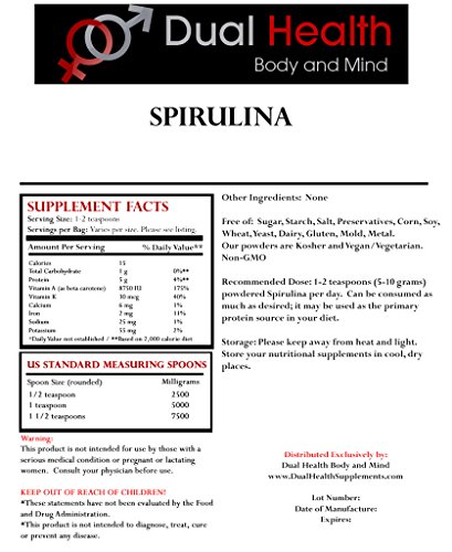 Studio : Dual Health Body Mind Publisher : Dual Health Body Mind Binding : Health and Beauty Product Description Micro-algae, which is highly nutritious and an excellent source of protein, chlorophyll, vitamins, minerals and amino acids. Benefits: Spirulina provides more stamina, strength, better nutrient absorption and is safe for children and pregnant women (check with your heath care professional first). Spirulina powder is approved by both the FDA and WHO as a healthy food. Spirulina powder is very popular among athletes and bodybuilders. Spirulina health effects include immune system enhancement, reducing the harmful blood fats, reducing the toxicity of heavy metals and radiation protective effects. Spirulina powder can be added to fruit or vegetable juices to make it more nutritious. It is tasty in soups, salads, pasta or mixed with yogurt. 0