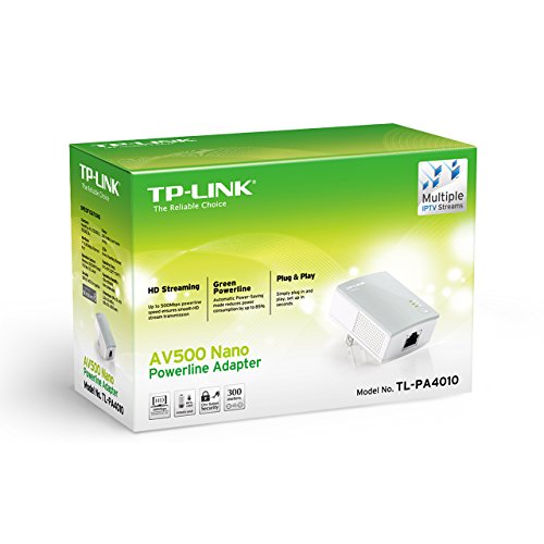 The AV500 Nano Powerline Adapter transforms existing power lines into high-speed networks without requiring configuration, drilling, or the installation of new wires. Simply plug a pair of the adapters into power sockets to quickly establish networking infrastructure with a 300-meter range that travels well through walls and floors. Reaching speeds of 500Mbps, the TL-PA4010 lets you stream HD video and game online without lag, making it ideal for use as part of a multimedia entertainment network.