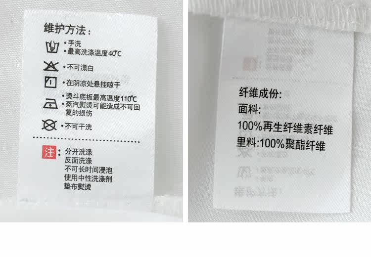 洗涤标准:不可浸泡不可漂白悬挂晾干40℃以下手洗110℃以下反面熨烫不可干洗