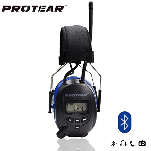 -. Feature : ►BUILT-IN-RADIO & BLUETOOTH AND MP3 COMPATIBLE: Built-in digital bluetooth and FM/AM radio ear defender come with standard stereo jack cable for phone, mp3 player, hands-free calling, convert surrounding noises into your favorite radio program or music, say goodbye to boring and harmful noise from now on. / ►REDUCE THE NOISE AROUND YOU: The ear protection safety muffs can not only be used as shooters ear muffs, but also great for hunting, indoor gun range, racing, reading, concert, studying and operating machinery to protect hearing, especially suitable for work in construction and landscaping work. / ►COMFORTABLE WEARING AND ADJUSTABLE HEADBAND: Equipped with double layer soft foam and adjustable headband, this ear protection safety earmuff fits all head sizes for both adults and children, padded headband and well-sealed ear cups keeps your ears comfortable even if wear it for hours. / ►PRESET RADIO CHANNELS AND DIGITAL DISPLAY: Protear bluetooth & radio ear defender can not only scan radio stations frequency automatically but also preset and memory up to 40 channels, so that you can choose your favorite radio program easily. Digital display can show time, Bluetooth, AM/FM frequency, battery status. / ►NRR SOUND TECHNOLOGY, ANSI S3.19 TESTED & CERTIFIED: Noise reduction rating (NRR) of 25(dB), conform to American Standard, operate on 3 AAA batteries. Your satisfaction is guaranteed or your money back. For more great product please search "Protear" on Amazon.