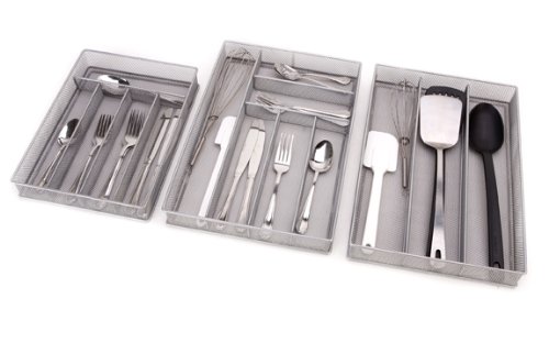 Studio : Panacea Grayline Publisher : Panacea Grayline Binding : Kitchen Product Description This utensil mesh organizer is provides 3 separate sections for easy silverware storage. Its compact design will fit in any standard drawer. It can also be used to store and organize any number of other items including office supplies, sewing supplies, or any number of other items. 0