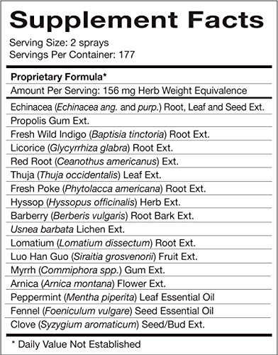 -. Feature : Multi-herbal throat spray featuring echinacea, propolis, and red root* / Provides localized relief to the throat* / Supports healthy immune response* / Promotes lymphatic drainage* / Encourages healthy microbial balance* / Sested Use: Spray 2 times in back of throat and swallow. Use three times daily or as directed by your health care practitioner. Shake well before using. / DOES NOT CONTAIN: Wheat, gluten, soy, milk, eggs, fish, crustacean shellfish, tree nuts, peanuts