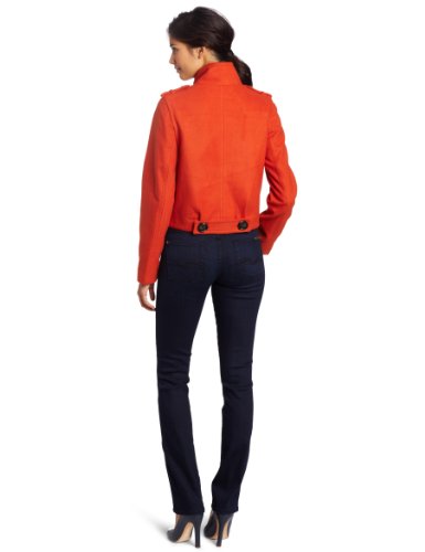 Medium weight jacket with brown detailed buttons. Contemporary detail on back.