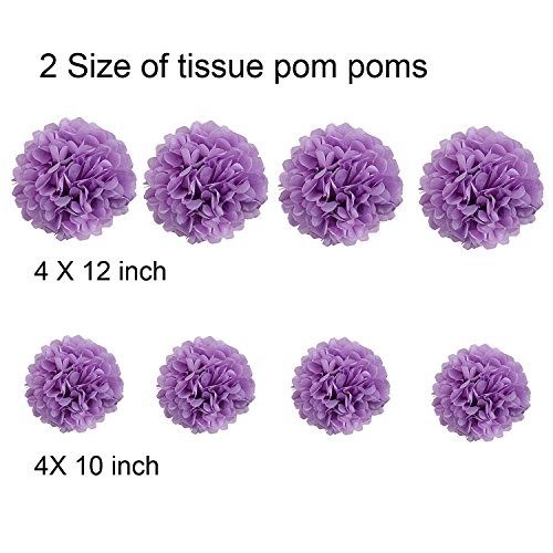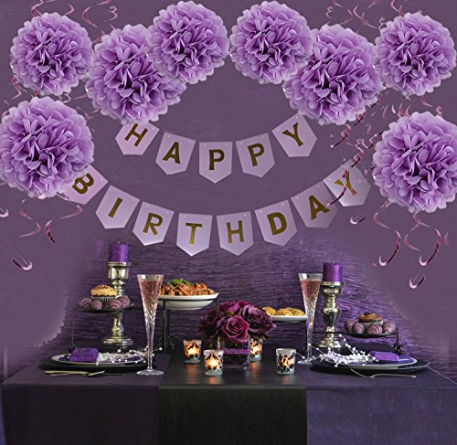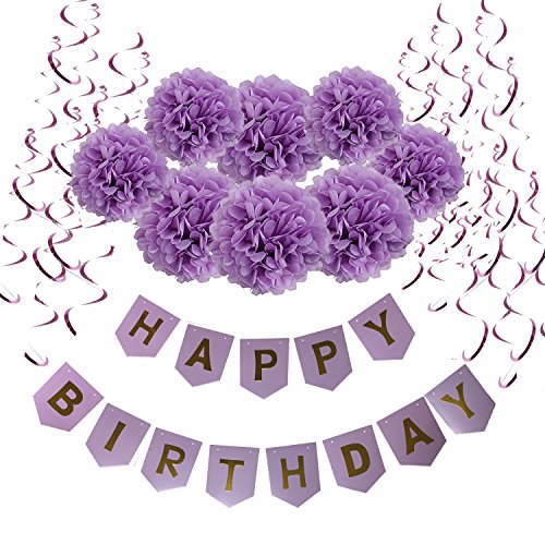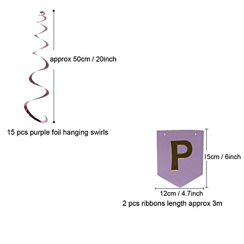 Packaged includes: 13 purple flags flag band ("HAPPY BIRTHDAY") , 8 x purple Pompoms paper flower ( 4 x 25cm and 4 x 30cm ) and 15 x purple Hanging Swirls Birthday Party Supplies.
