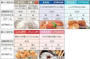 「赤飯」「おこわ」コース 蒸した場合、下準備(浸水やざる上げ)を含め約13時間かかる赤飯の炊飯時間を、わずか46分に短縮。 加熱パワーと時間の最適化を図り、スチーム温度をアップすることで、蒸し器で作ったようなもちもちした弾力のある赤飯・おこわが炊ける。 |