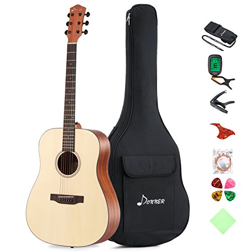 Product Description This Donner DAG-1C cutaway acoustic guitar bundle includes all the accessories you need to start playing right out of the box. Bundle includes Donner DAG-1C cutaway acoustic guitar, good quality gig bag, guitar capo, DT-2 tuner, strings, strap, picks, and polishing cloth. Save yourself time and money with an all-in-one acoustic guitar bundle! The DAG-1C features a spruce top with scalloped bracing, Mahogany back and sides, chrome tuner keys, a good quality brass strings and a PVC pickguard. Tuning Pegs are made of Steel for easy tuning and to keep the tuned string held in position. Not only does it have everything you need to learn and play acoustic guitar, but it's also priced so affordably that jumping in doesn't require a big investment. The guitar offers warm, vibrant, sound in your hands at a great price with a choice of convenient and practical features that will have the beginning guitarist in your house strumming away in no time. Pick up it to join in the growing guitar fanfare! Enjoy your own fun and colorful life.