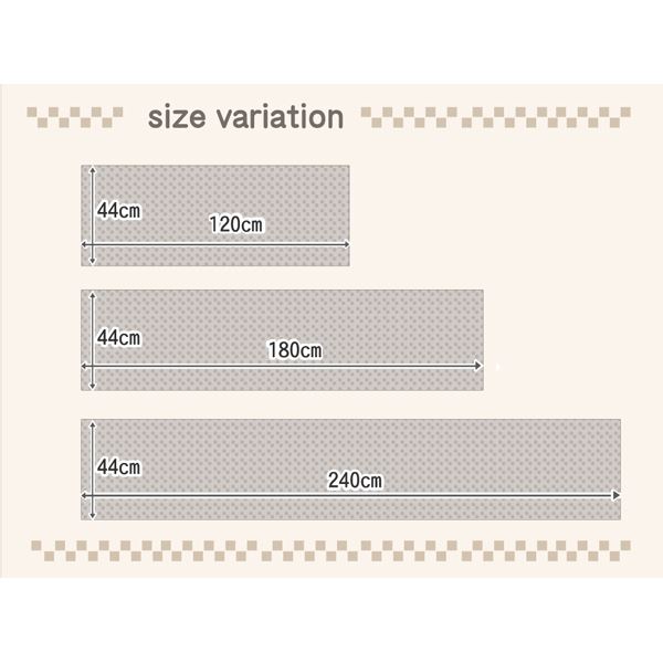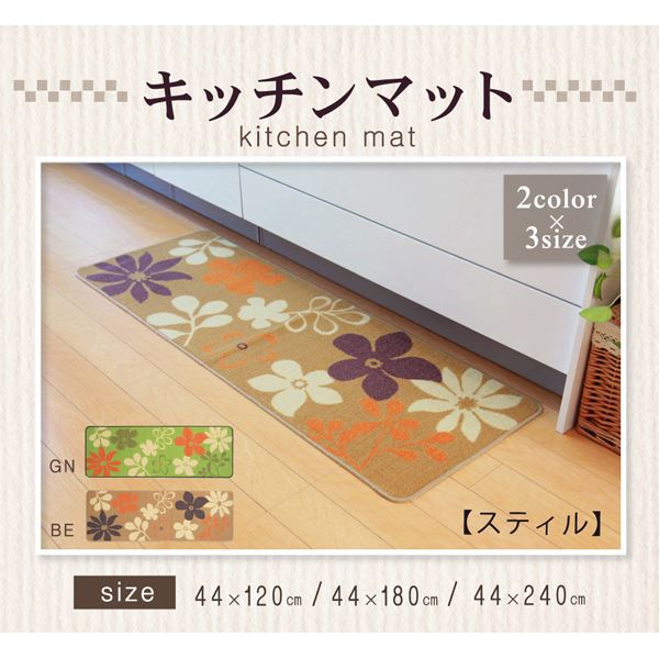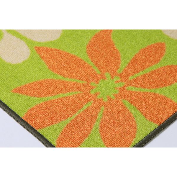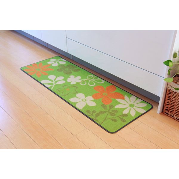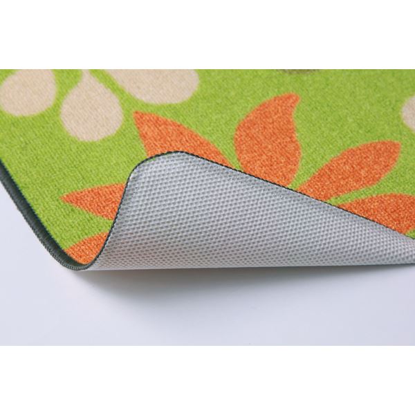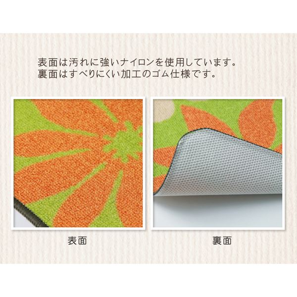 花柄をプリントしたカジュアルなキッチンマットです。表地にはナイロンを使用しています。ナイロンには強度があり摩耗に強いという耐久性に優れた面や、汚れが落ちやすく速乾性があるなどのマットに適した特徴があります。裏面にはすべりにくい加工を施しています。