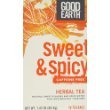 -. Binding : Grocery -. Brand : Good Earth -. EAN : 0027018301356 -. Feature : Each box containing 18 individually wrapped tea bags / Made from rooibos leaves, rose hips, and chamomile / No sugar or caffeine; just 3 calories per serving / A spicy, full-bodied herbal tea enjoyable hot or iced -. IsAdultProduct : 0 -. Label : Good Earth -. LegalDisclaimer : Peter Flack and P.F.Enterprises Also know as pe7e is not responsible for any damages health or otherwise from the use of this product. -. Manufacturer : Good Earth -. Model : 027018301356 -. MPN : 027018301356 -. PackageQuantity : 1 -. PartNumber : 027018301356 -. ProductGroup : Grocery -. ProductTypeName : GROCERY -. Publisher : Good Earth -. Studio : Good Earth -. Title : Good Earth, Original Sweet & Spicy Caffeine Free Herb Tea, 18 ct -. UPC : 027018301356