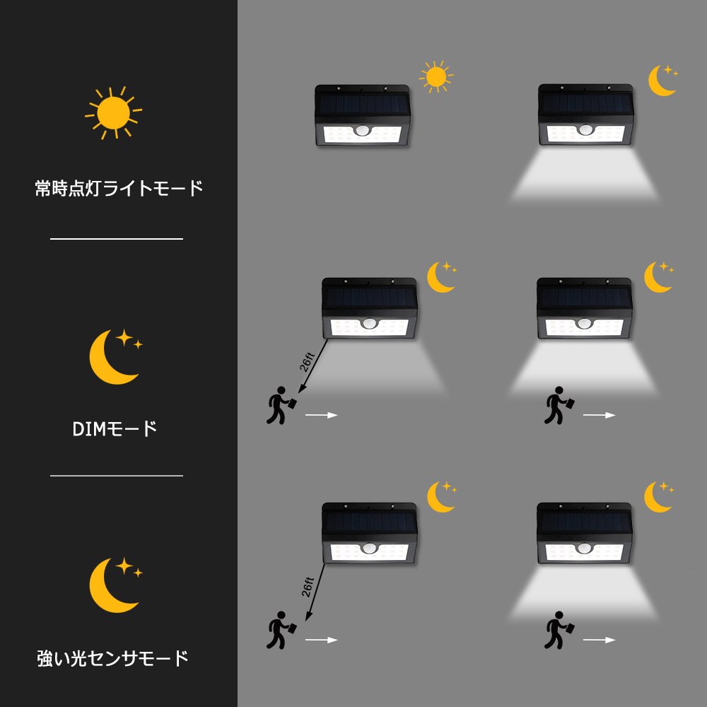 ① Always on light mode: At night, it lights automatically, and it provides strong and bright light until accumulated power is cut off.