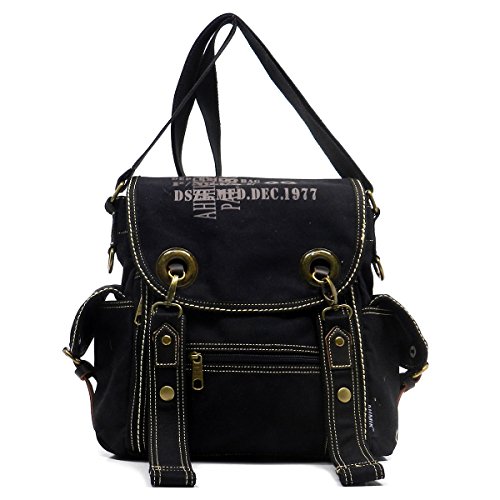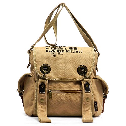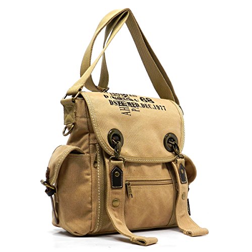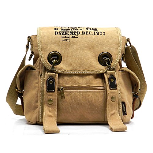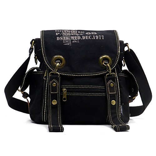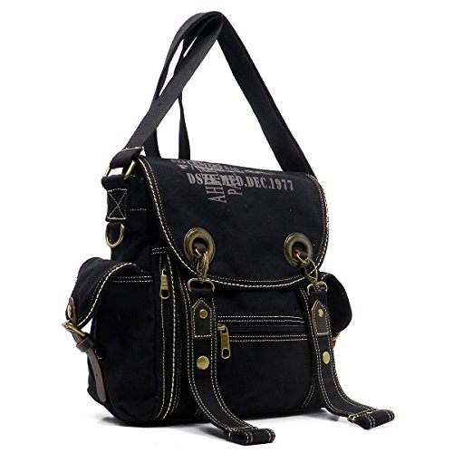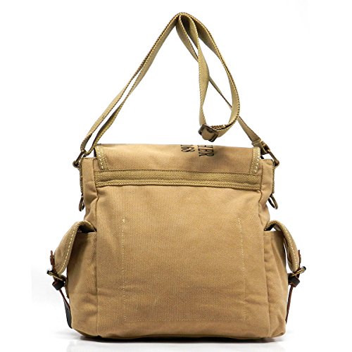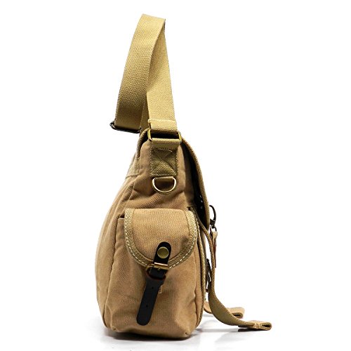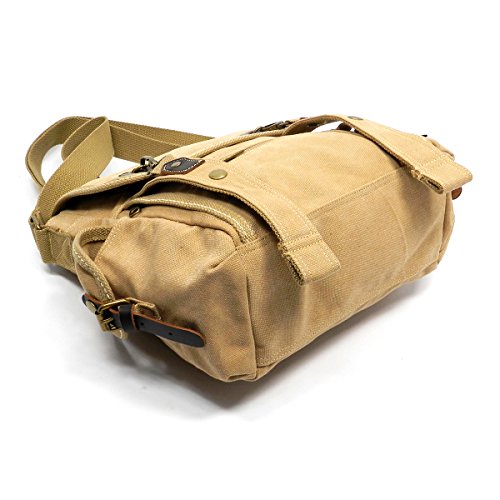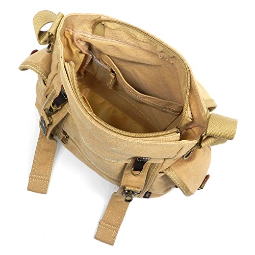Product Description Canvas Messenger Bag. Cotton Canvas. Brass-tone hardware. Zip top closure. Flap with clasp closure. Front Pocket side pockets. 2" Wide Adjustable shoulder strap. Quality fabric lining interior. Interior lining with multifunctional slip pockets and a back wall zip pocket. Measure 12.5" length, 4" width, 12" height. 0