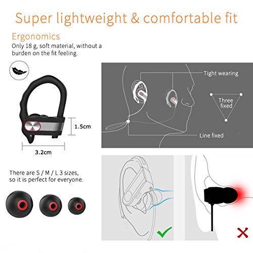 Leichte angenehme Passform: Das ergonomische Design mit 15 ° Winkel und leichten 18 Gramm Gewicht passt sich Ihrem Ohr sehr gut an und belasten es auch bei langem Tragen nicht. Mit den weichen Silikon-Ohrhorern wird der Gehorkanal gut verschlossen fur einen guten Sitz und einen noch besseren Klang. Vor allem bei intensiven Aktivitaten halt der Over-Ear-Bugel den Ohrhorer an jedem Ohr perfekt halt ohne zu drucken. (inkl. 2 Paar Silikonaufsatze und 1 Paar Gerauschunterdruckungsaufsatze)