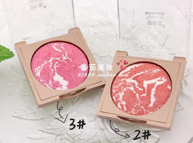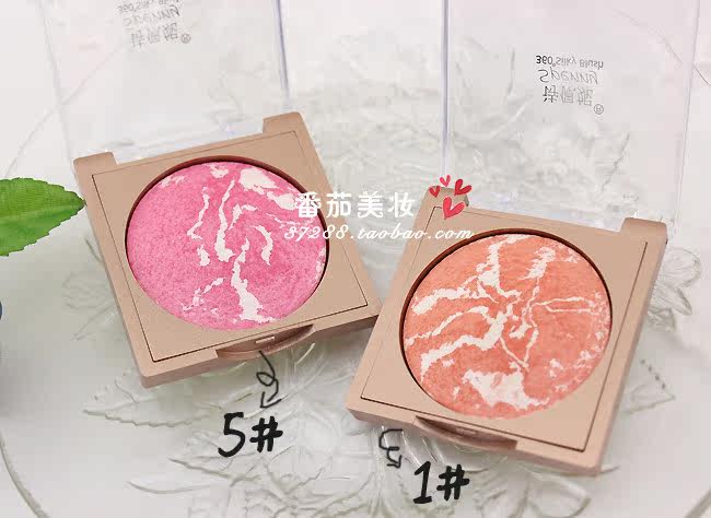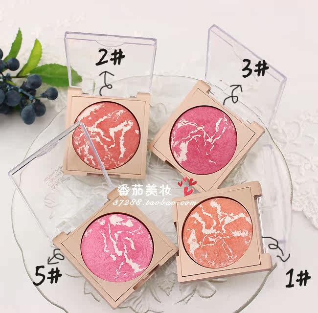 - 1#和2#都是橘色系的,1#偏橘,2#偏红 3#和5#是属于粉色系的,3#偏红,5#偏粉 每个腮红都有带白色高光,纹路都是随机的,白色高光可以作为提亮用。 |