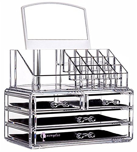 Cq acrylic 4 Drawers and 16 Grid Makeup Organizer with Cosmetic Storage Cases,9.4"x5.3"x7.3",Clear 2 Piece Set With Mirror