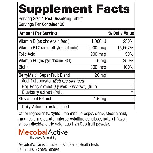 B-12 Energy BerryMelts Formula now includes the super fruits Acai and Goji Berry. This innovative Vitamin B-12 energy-support formula is designed to give you a safe energy melt in a convenient, quick dissolve mini-tablet. The ideal alternative to caffeinated pills, energy shots or beverages, B-12 Energy BerryMelts fit easily in a purse or a pocket, making it perfect for people who need a B-12 energy lift even when they're on the go.
