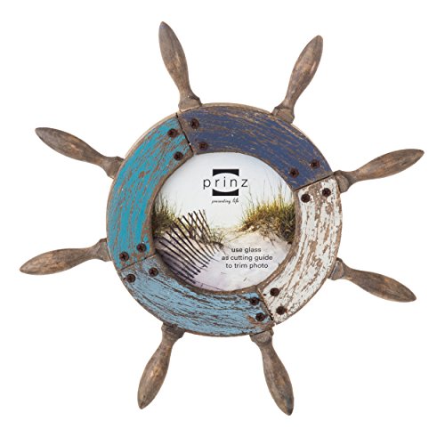 -. Title : Prinz Ship's Wheel Wood Frame in Distressed White and Blue Finish, 4 by 4-Inch
